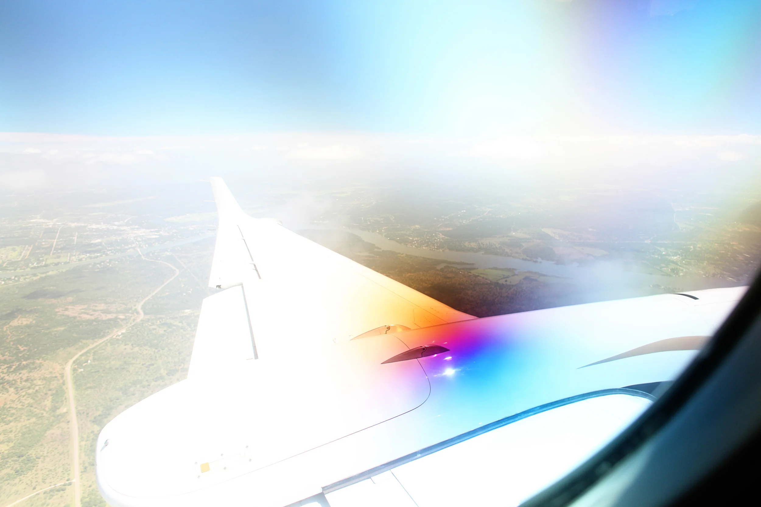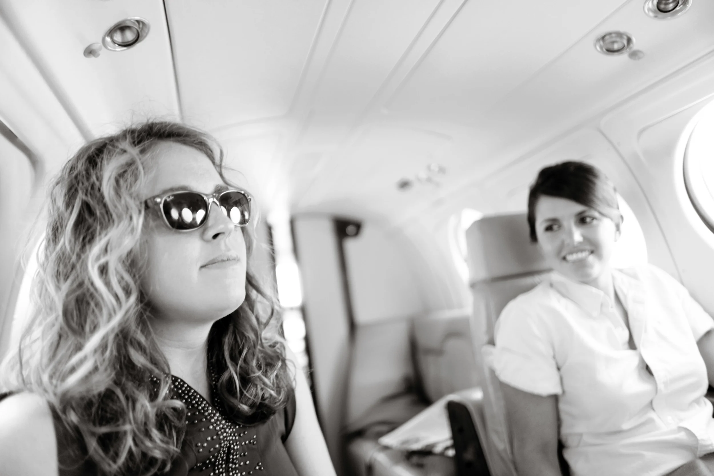 Before take-off. I thought Leslie's glasses were super cool reflecting the plane's windows.