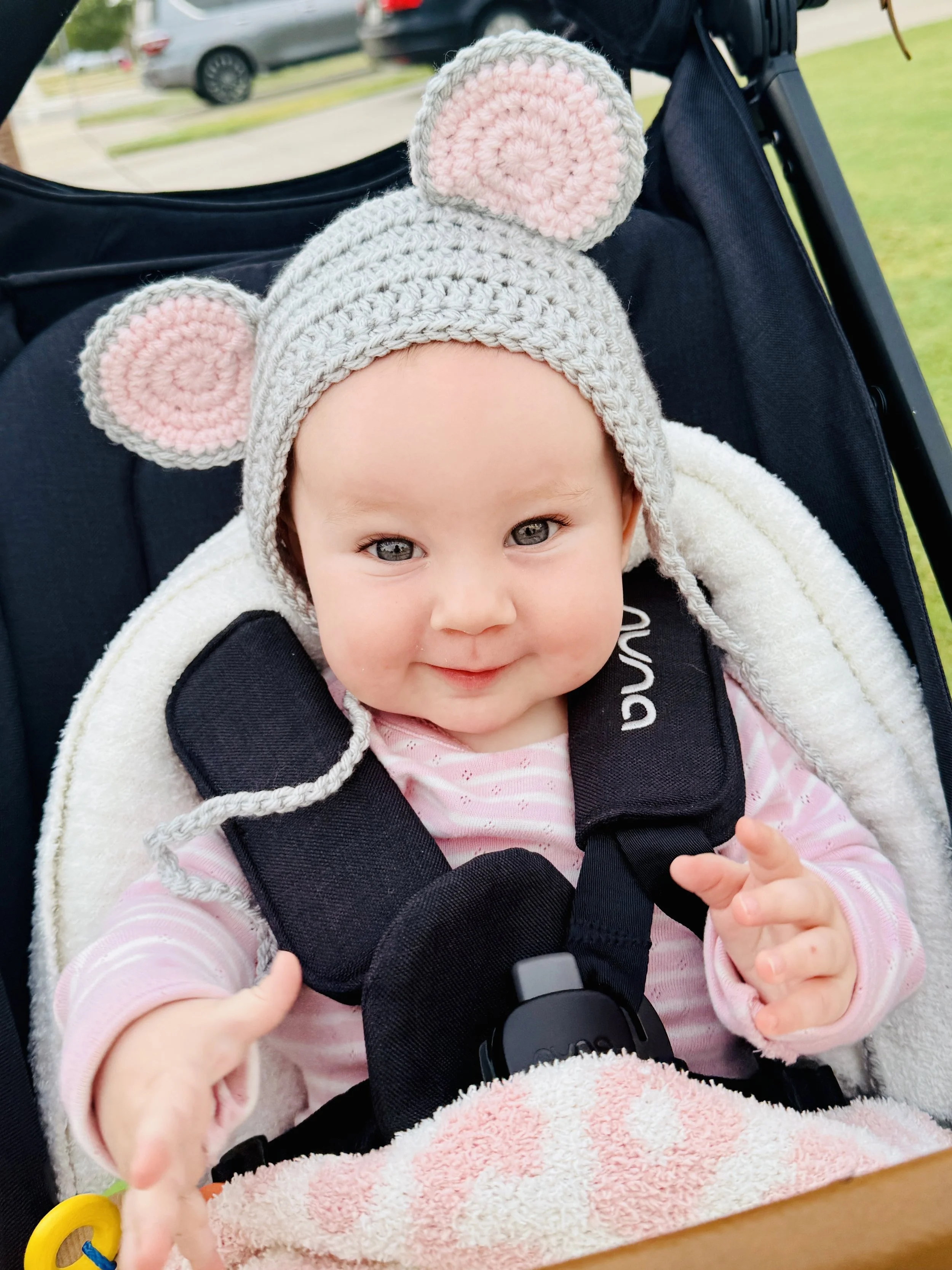 We pack gear each day according to the weather. Her mouse ears above were from a Halloween costume, she went as a mouse in the book, “if you give a mouse a cookie”. Sometimes it’s chilly so we bring the ears.